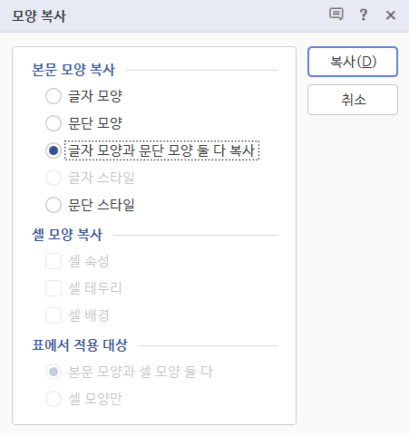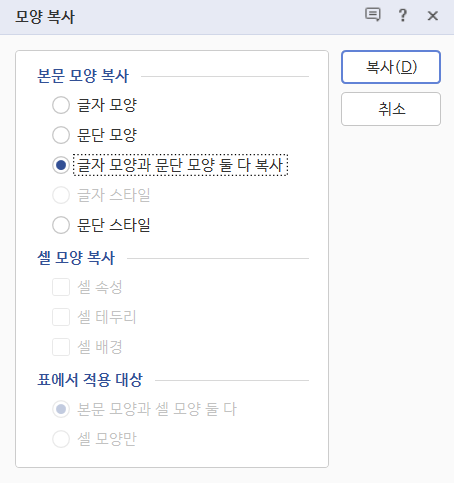 모양 복사 창이 열리면 본문 모양 복사에 4가지 스타일이 활성화 되어 있습니다. 그중 원하는 걸 체크하시면 되는데 저는 글자 모양과 문단 모양 둘 다 복사를 선택했습니다. 선택 후 복사를 클릭합니다
