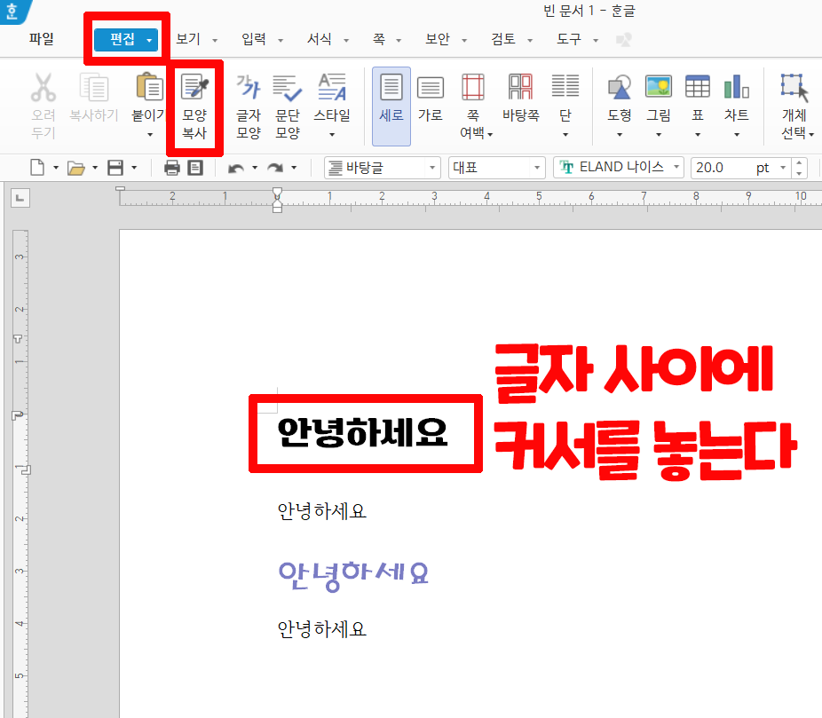 예시로 작성한 안녕하세요를 2개는 다른 서식으로 2개는 같은 서식으로 작성했습니다. 첫번째 안녕하세요 글자 앞이나 글자 사이에 커서를 놓습니다. 그 상태에서 위에 메뉴 창에 편집을 클릭한 후 아래에 있는 모양 복사를 클릭합니다
