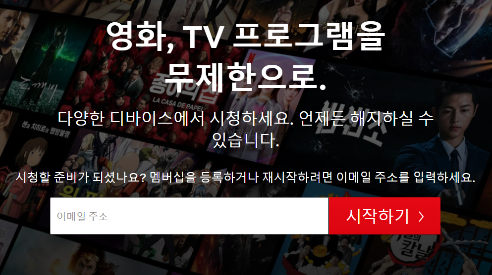필자는 컴퓨터에서 하는 진행하게 되었습니다. 넷플릭스를 켜줍니다. 그럼 상단에 이메일 주소 입력창이 있는데 그곳에 본인이 사용하고 이메일 주소를 입력하고 시작하기를 클릭합니다