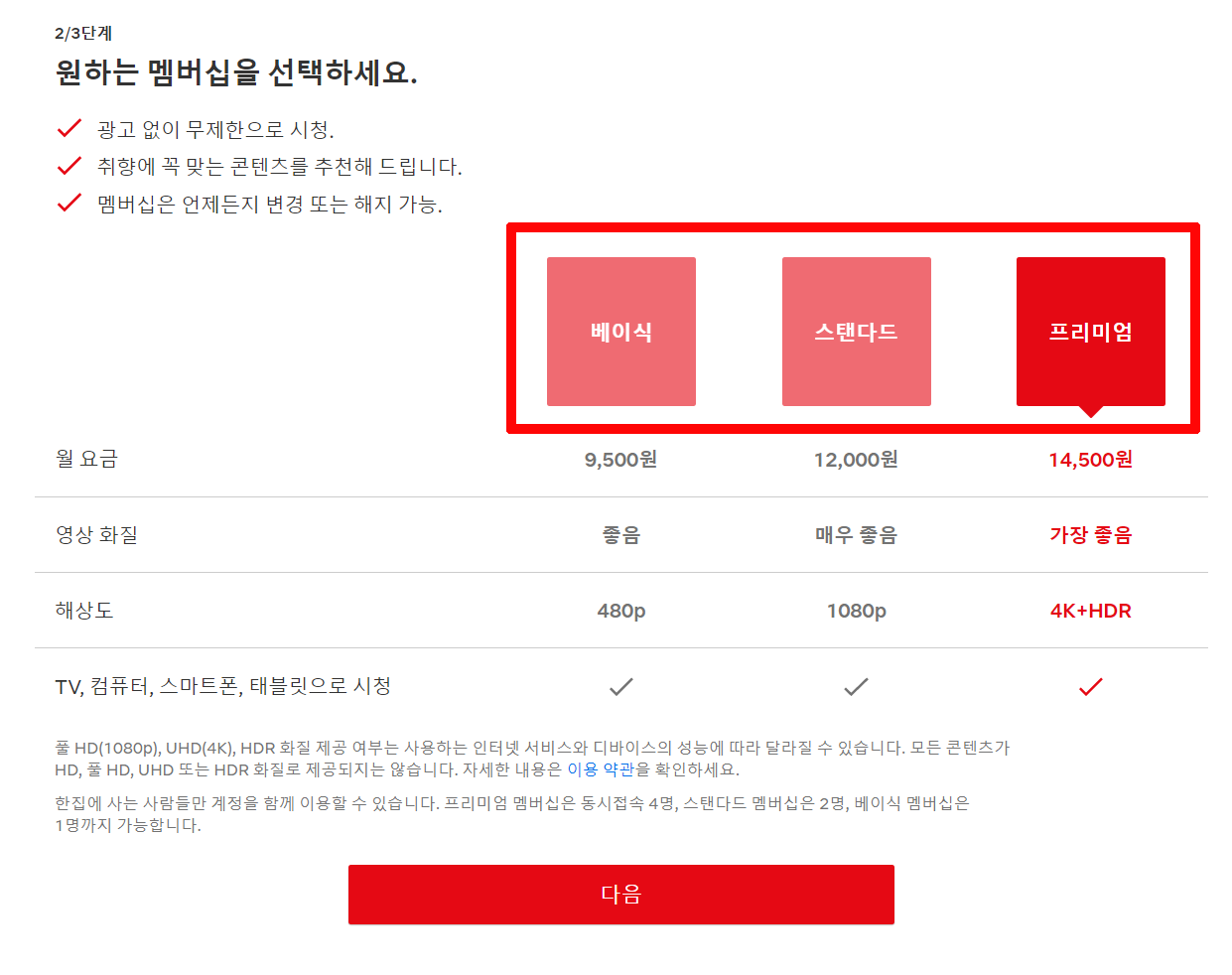멤버십 요금제 보기로 이동하면 3가지 요금제에 대해 알 수 있습니다. 베이식과 스탠다드, 프리미엄으로 나눠지며 요금의 차이는 영상 화질, 해상도의 차이와 동시접속 가능한 인원에 차이로 금액이 나눠집니다