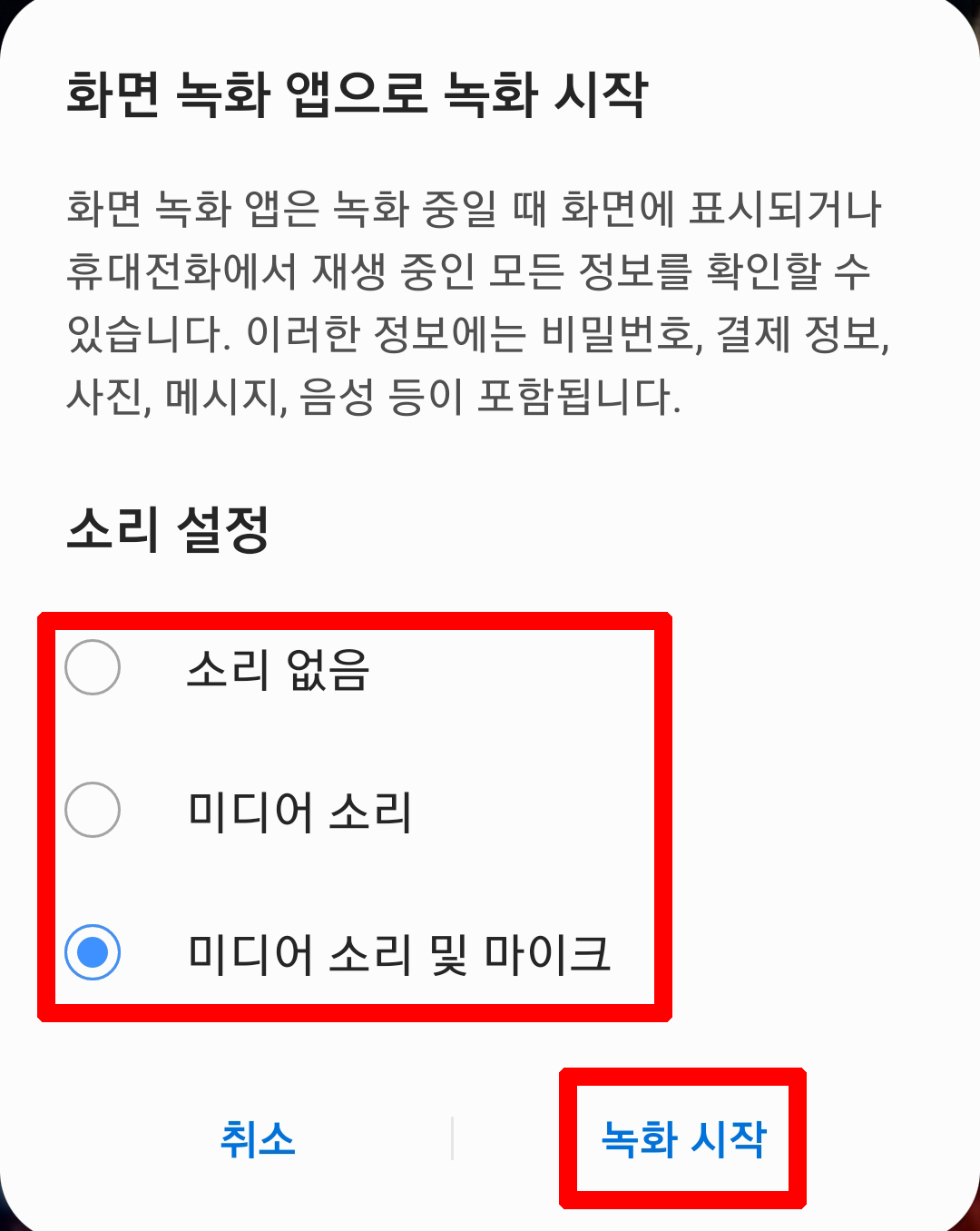 화면 녹화를 클릭하면 안내 메세지가 나오는데 소리 설정에서 소리 없음, 미디어 소리, 미디어 소리 및 마이크 중 원하는 곳을 선택한 후 녹화 시작을 클릭합니다