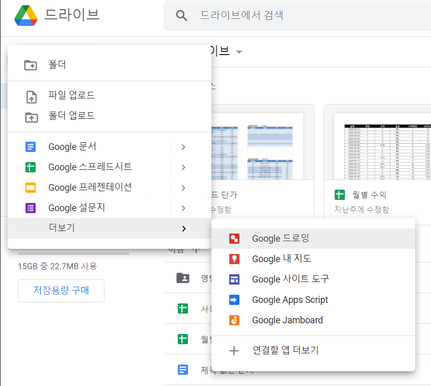 새로 만들기를 클릭하면 파일, 폴더 업로드 및 문서 관련 여러 가지 항목들이 있습니다. 구글 문서는 한컴과 비슷하고 스프레드시트는 엑셀, 프레젠테이션은 파워포인트, 설문지는 말 그대로 설문지를 만들 수 있는 문서입니다. 그리고 다른 항목도 있으니 본인이 필요한 서류에 맞게 사용하시면 됩니다