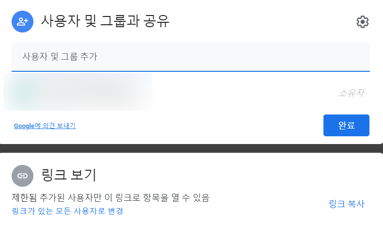 공유를 클릭하면 두 가지 방법으로 공유할 사람을 지정할 수 있는데 위에는 연락처, 이메일 등 저장된 사람에게 공유하는 방법과 두 번째 링크 보기는 링크 주소를 함께 공유할 사람들에게 보내어 링크로 접속한 사람들이 해당 파일을 볼 수 있는 권한을 줄 수 있는 방법입니다