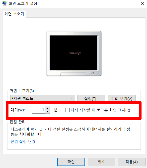 화면 보호기 이미지를 설정했다면 대기 시간을 지정해주고 다시 시작할 때 로그온 화면 표시를 원하는 경우 체크해준 후 확인을 클릭하면 됩니다