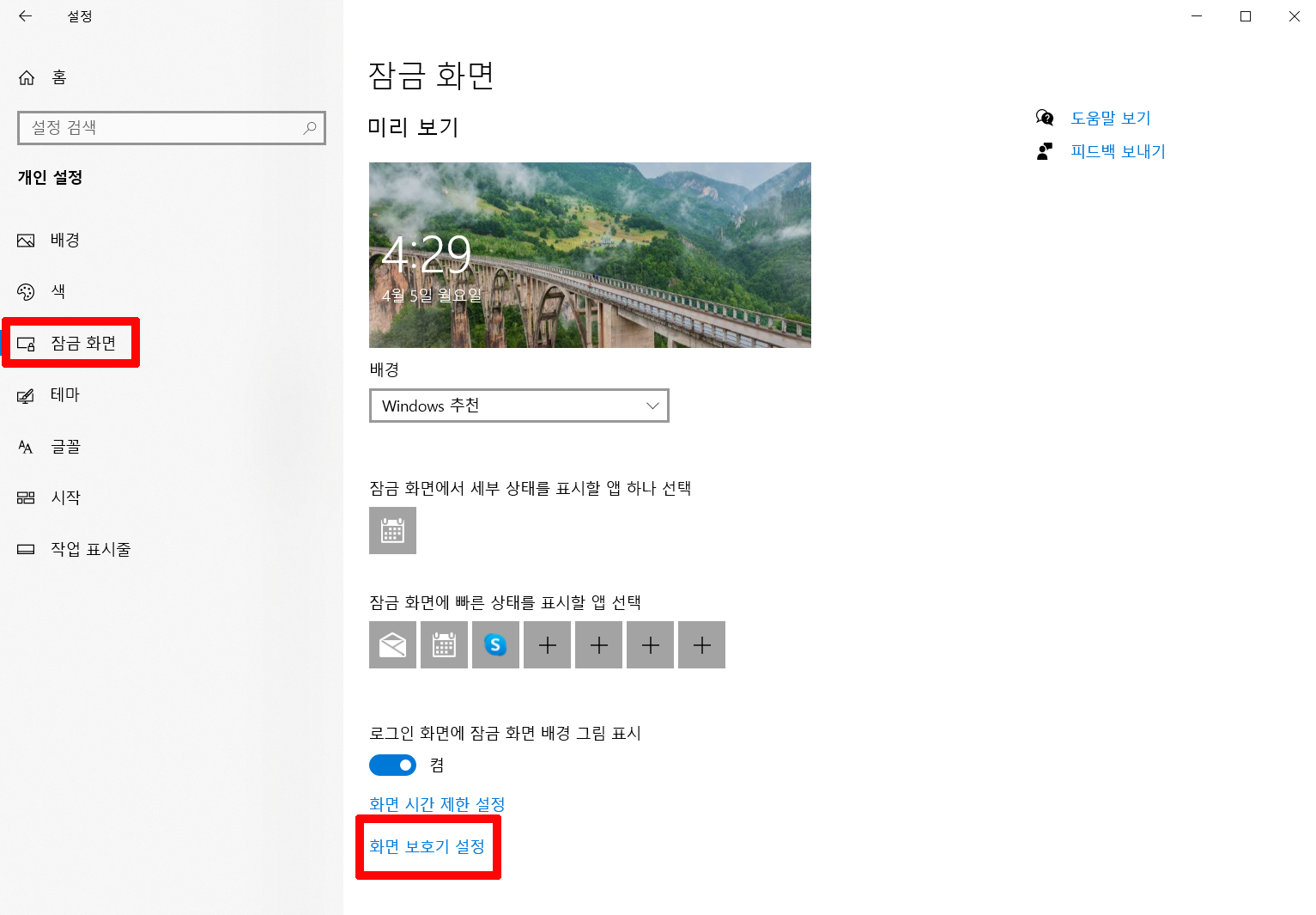 개인 설정 창이 열리고 왼쪽 항목 중 잠금 화면을 클릭합니다. 오른쪽 맨 아래에 있는 화면 보호기 설정을 클릭합니다