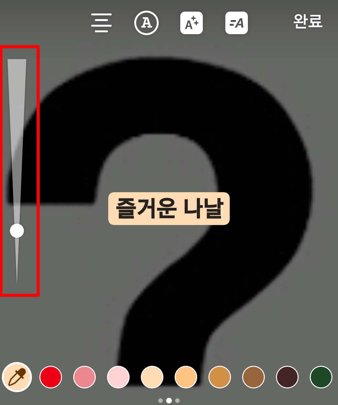 왼쪽에는 동그라미를 위아래로 조절하면 글자가 커졌다 작아져 크기를 조절할 수 있습니다. 효과를 다 했다면 완료를 클릭합니다