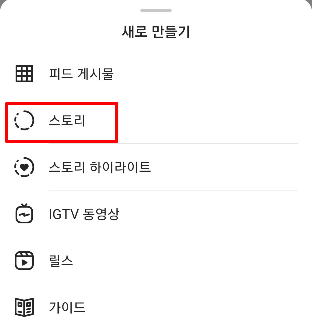 아래 새로 만들기 창이 나오고 스토리를 클릭합니다