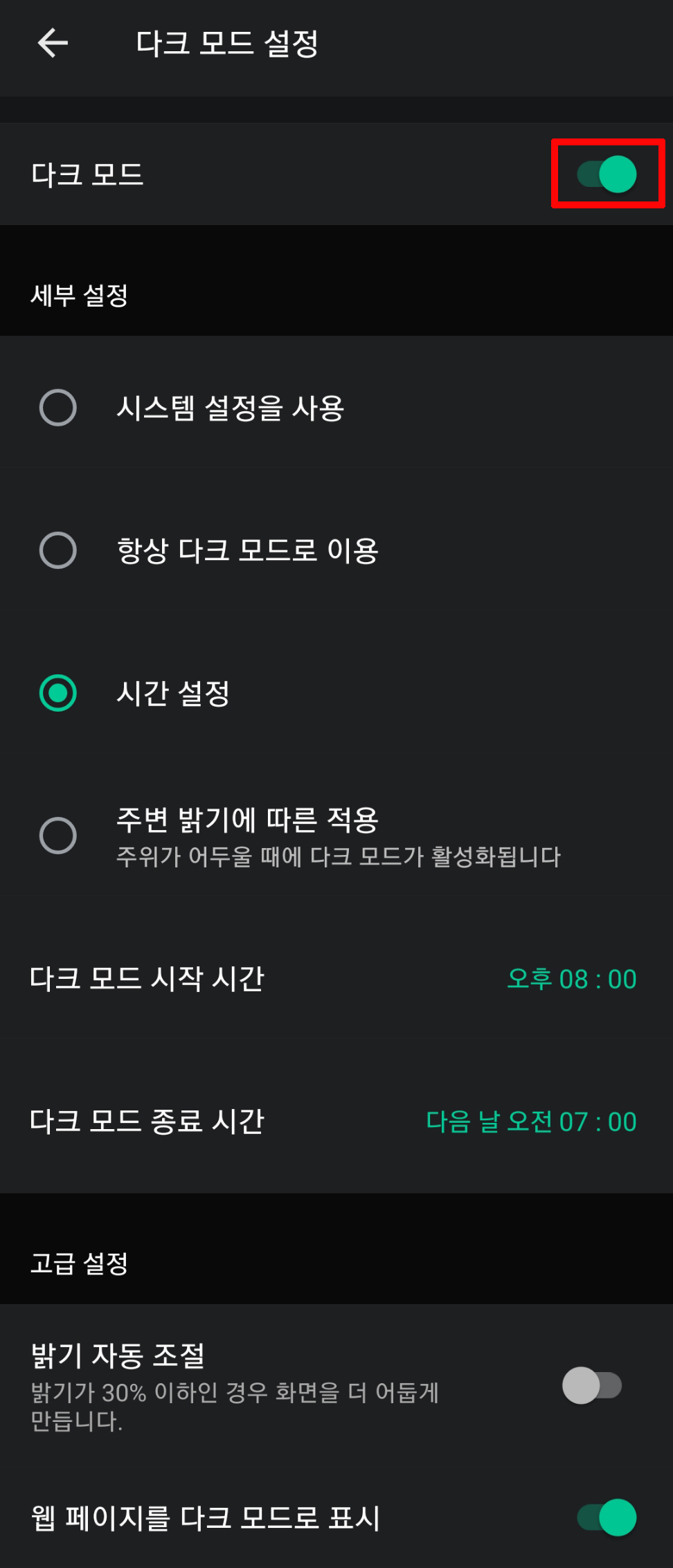 설정으로 이동하면 고급에 있는 다크모드 설정을 클릭합니다