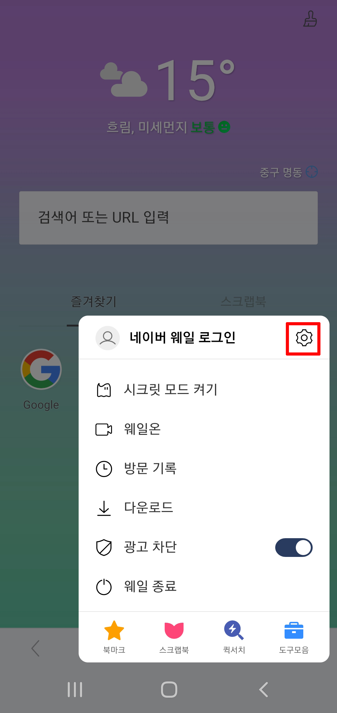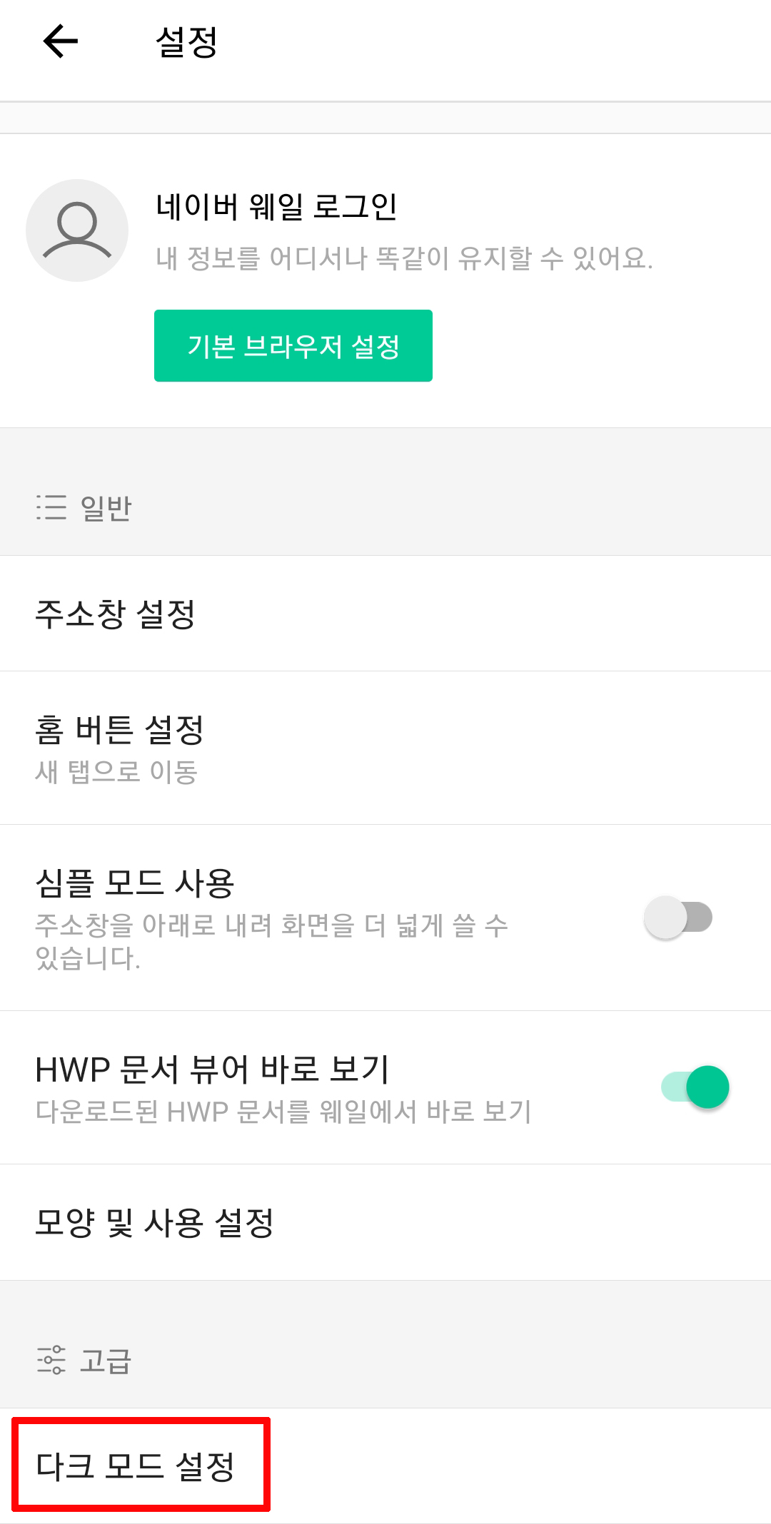 네이버 웨일 모바일 다크모드 설정 해제 방법